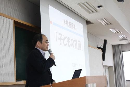 模擬授業では社会福祉学科 吉永 純教授が「子どもの貧困」をテーマに、パワーポイントや映像教材を使用して講義を展開しました。高校ではなかなか学ぶことのない社会的な問題をテーマにした内容ということで、大学ならではの講義を体験していただきました。