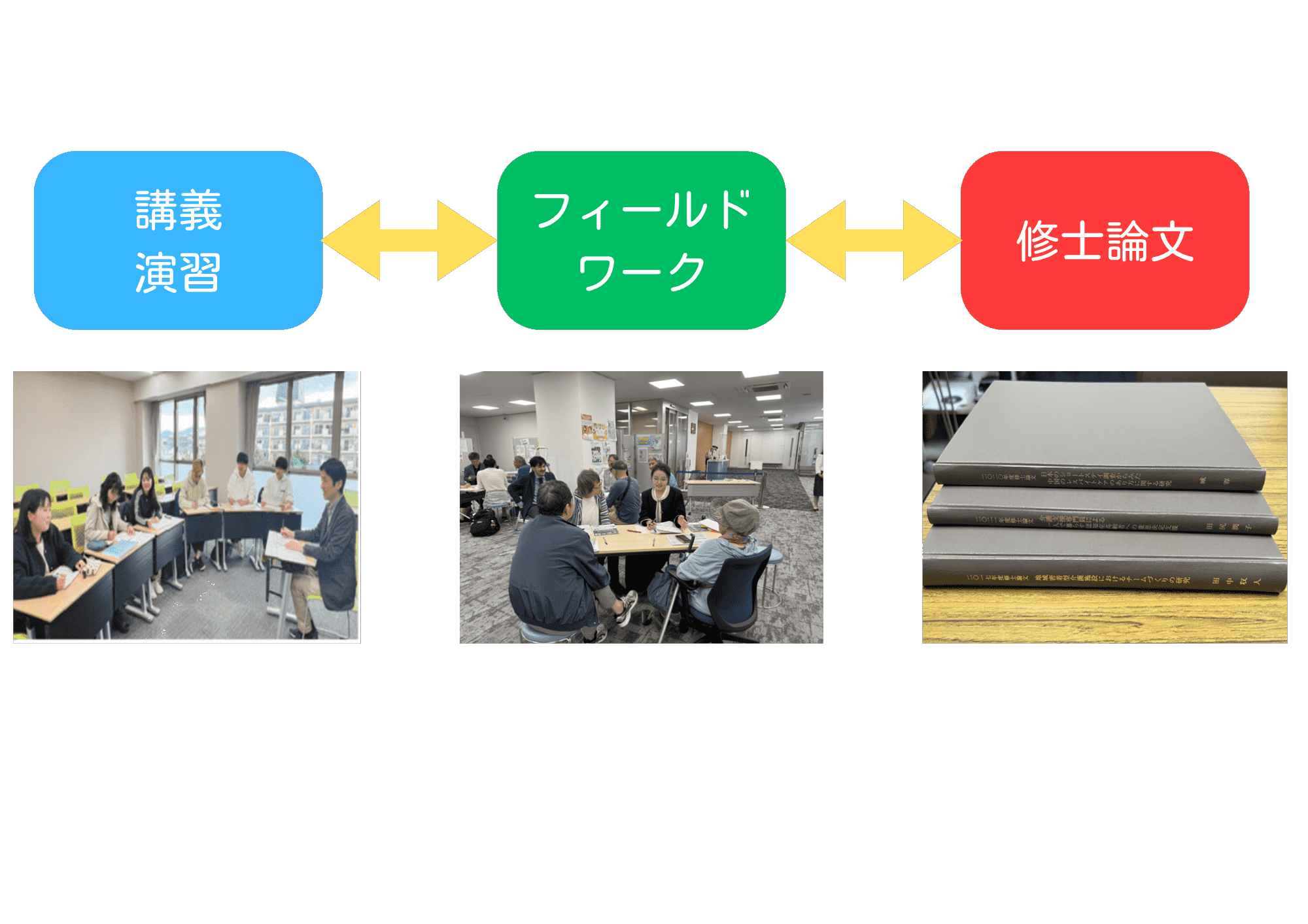 また、机上の研究活動にとどまらず、現場経験が豊富な教授陣のネットワークを活かして、社会福祉施設・機関での実践活動や地域の住民組織・団体等でのフィールドワークなど、学外での実践的な学びの機会も充実しています。このような講義・演習およびフィールドワークで得られた学びと知見をふまえて、修士論文を作成に取り組んでいきます。