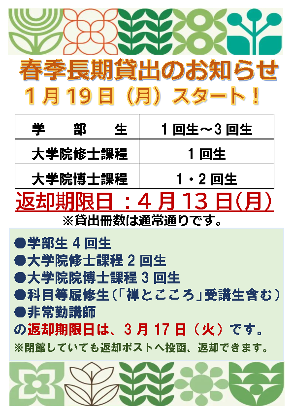 3/17(火)までにすべての貸出資料を返却いただきますよう、お願いします。