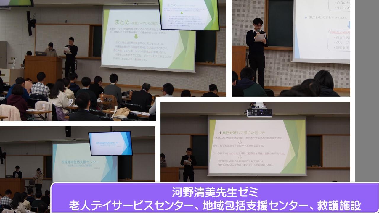 河野ゼミでは、老人デイサービスセンター、地域包括支援センター、救護施設の実習での体験が語られました。「全ての取り組みが利用者中心に考えられている」「利用者一人一人は個々の存在であり、同じ支援の仕方は存在しない」「本人だけでなくまわりから得られる情報を見つけることの必要性」「地域を知るには住民の思いを知ること」など、それぞれの学びが語られました。