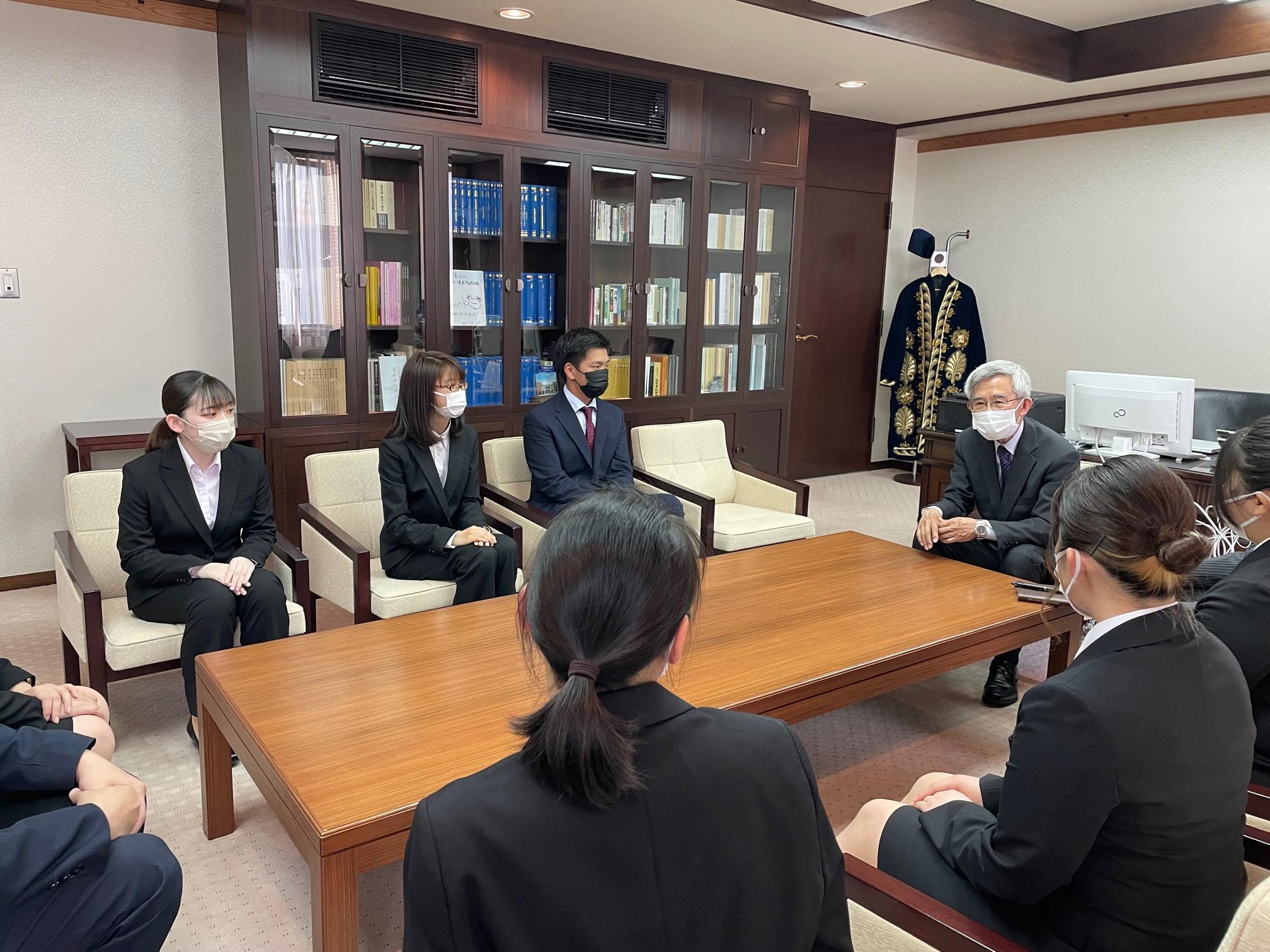 学長室に入り緊張しましたが、学長の言葉に皆で笑う場面もあり、和やかな雰囲気で報告することが出来ました。