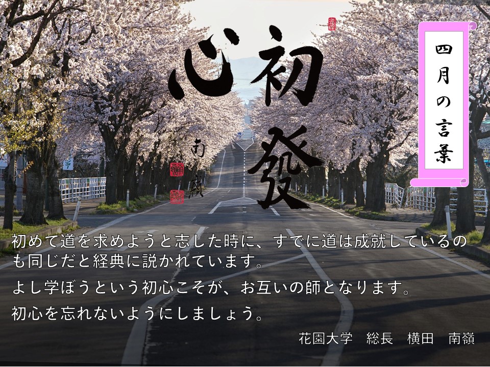 2025.04.01 トピックスお知らせ 四月の言葉「初發心」 初發心 初めて道を求めようと志した時に、すでに道は成就しているのも同じだと経典に説かれています。 よし学ぼうという初心こそが、お互いの師となります。 初心を忘れないようにしましょう。 花園大学 総長 横田 南嶺 前のお知らせ 一覧 次のお知らせ